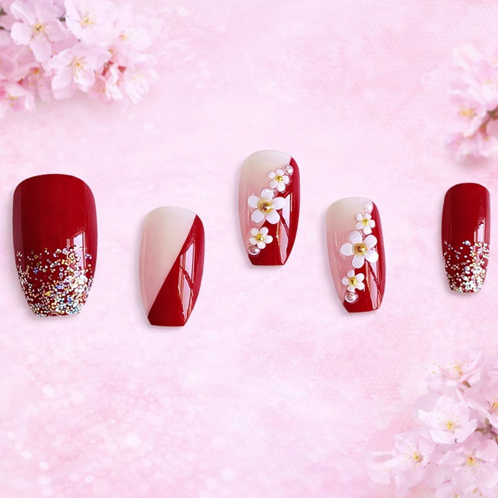 Enhance your beauty instantly with this reusable artificial nails set, designed to give you a salon-perfect manicure in minutes. Featuring a rich maroon color with elegant white flower accents and sparkling golden glitter, these nails add a touch of glamour to any look.