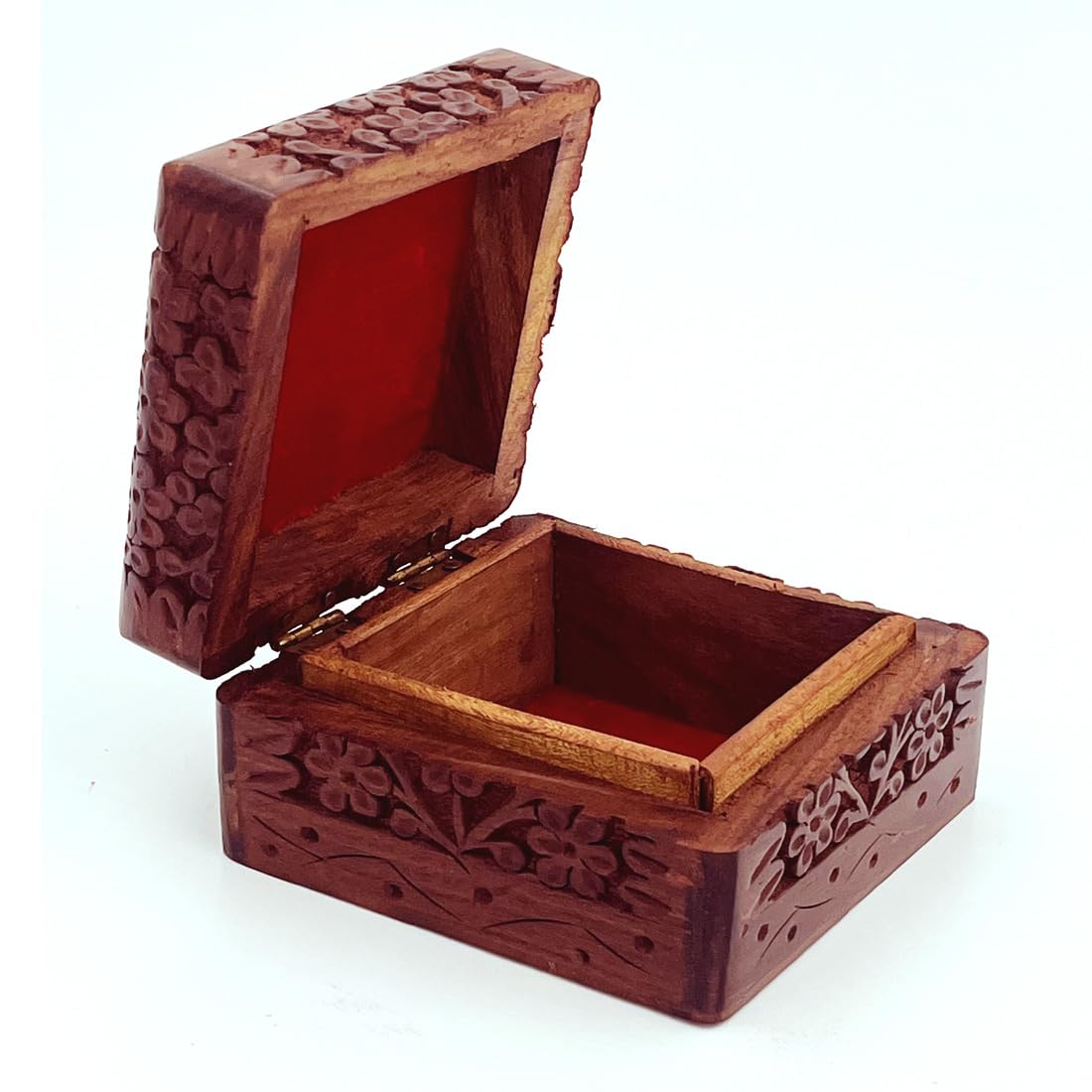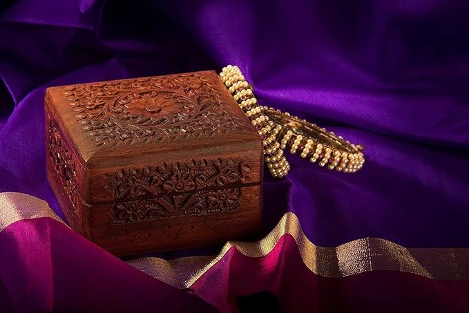Hand-carved Kashmiri wooden jewelry box for women, ideal jewel organizer in a compact 4×4 inch size