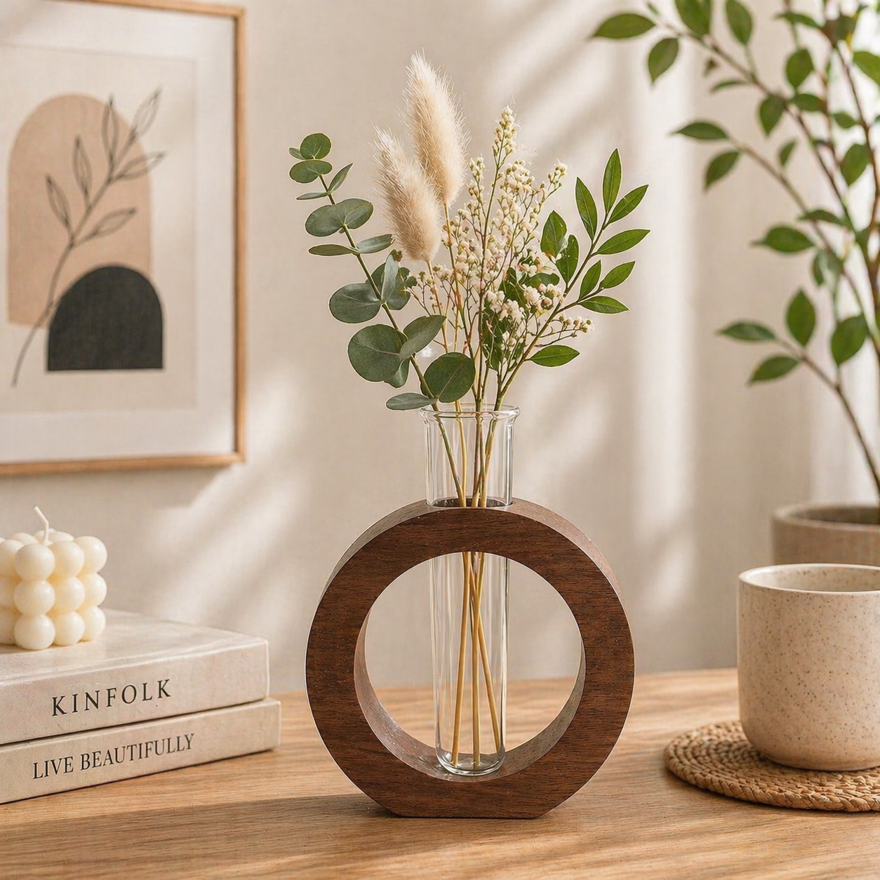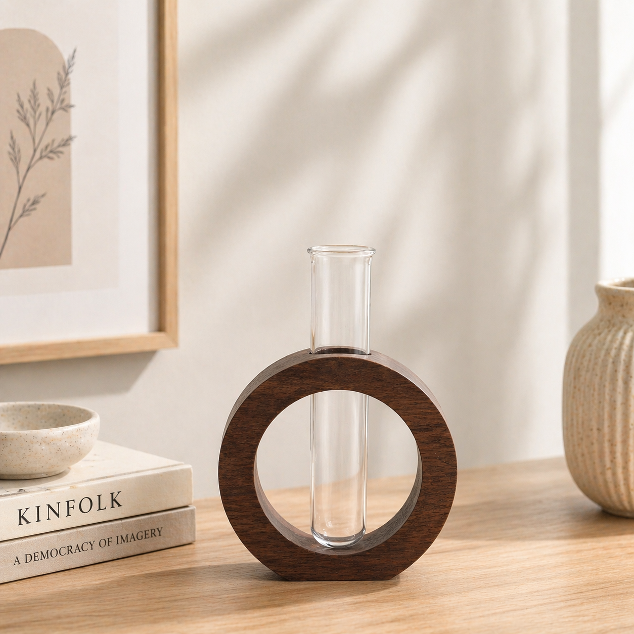Crafted with a high-quality natural wooden ring frame, this vase stands out with its smooth finish and sturdy structure. The circular wooden design symbolizes balance and harmony, making it not only a decor item but also a subtle statement piece. The included clear glass test tube fits seamlessly within the wooden ring, creating a floating effect that enhances its modern appeal. This combination of wood and glass creates a warm yet contemporary look that complements a wide range of interior styles, from minimalist and Scandinavian to modern and bohemian decor. A stylish modern glass tube vase for desks and offices. modern glass tube vase for home decor.